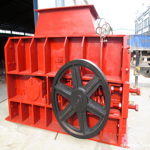 被破碎物料经给料口落入两辊之间依靠摩擦力的作用被带入辊子之间,进行挤压破碎,成品物料自下部落下。遇有过硬或不可破碎物时,辊子可凭液压缸或弹簧的作用自动退让,使辊子间隙增大,过硬或不可破碎物落下,从而保护机器不受损坏。相向转动的两辊子有一定的间隙,改变间隙即可控制产品最大排料粒度。双辊破碎机是利用一对相向转动的圆辊进行破碎作业。