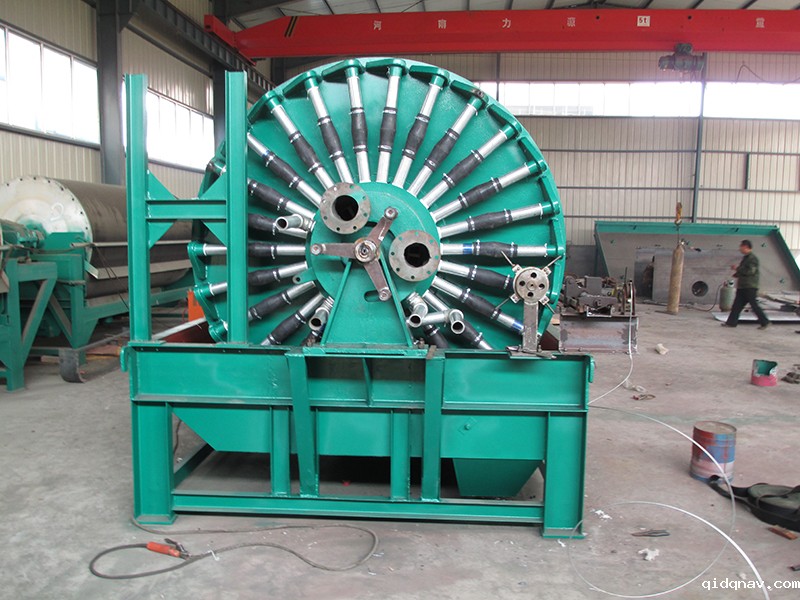 筒体内部装有锶铁氧体永久磁系,可促使磁性颗粒迅速吸附到滤布表面,由于是上部给料,使得滤饼中精矿按粒度分层的效果更加明显,当磁性精矿形成滤饼时,颗粒同时受到重力和磁力的作用,粗颗粒精矿比细颗粒精矿向滤布运动的快,精粒首先接触滤布,故滤饼的透气性好,而且矿浆中磁性颗粒在磁力吸引下呈放射状布于圆筒表面,并由于磁系极性变化而产生磁搅动作用,这都成为滤饼易脱水的有利条件,使得滤饼厚且透气性好,显著地提高了生产率,与同规格的筒形真空taptap安装安装 相比,其效率提高三倍以上。
