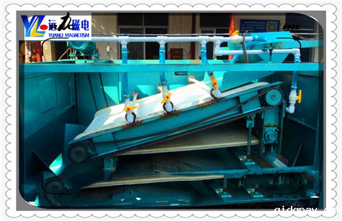 2、矿粒经输送带被送入上磁辊分选,由于铁矿的矿粒有磁性,立即被强磁场吸附在磁辊上,脉石粒由于没有磁性,磁辊的强磁对它不产生吸力,随着磁辊的转动,矿粒一直被吸在磁辊上,而脉石粒在磁辊转到前端位置时被抛出掉在隔矿板的前面,矿粒继续被磁辊带到脱磁区时自动掉入一选集矿斗收集为精矿成品。