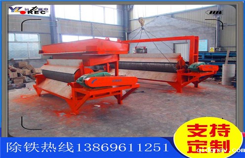 4、含有铁磁性杂质的物料通过受料斗经电磁振动给料机均匀的下到第一道输送皮带上,当物料通过强磁辊时,铁磁性物质被磁力吸引被吸附到强磁辊上,随着皮带的转动使其从磁场脱离并落入收集斗中。其它物料和没有选净的铁磁性物质随溜槽进入下一级磁选皮带进行分选,原理同上。最后选出合格的产品。